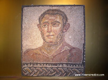 Mosaïque représentant le visage d'un athlète, 235 après JC.